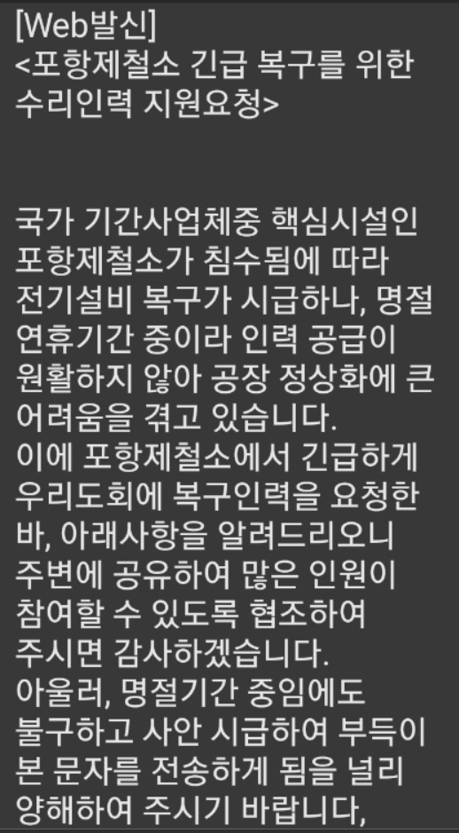 '포항제철소 긴급 복구를 위한 수리인력 지원요청' 이라는 제목으로 발송된 문자엔 일당 125만원이라는 문구가 눈에 띕니다.