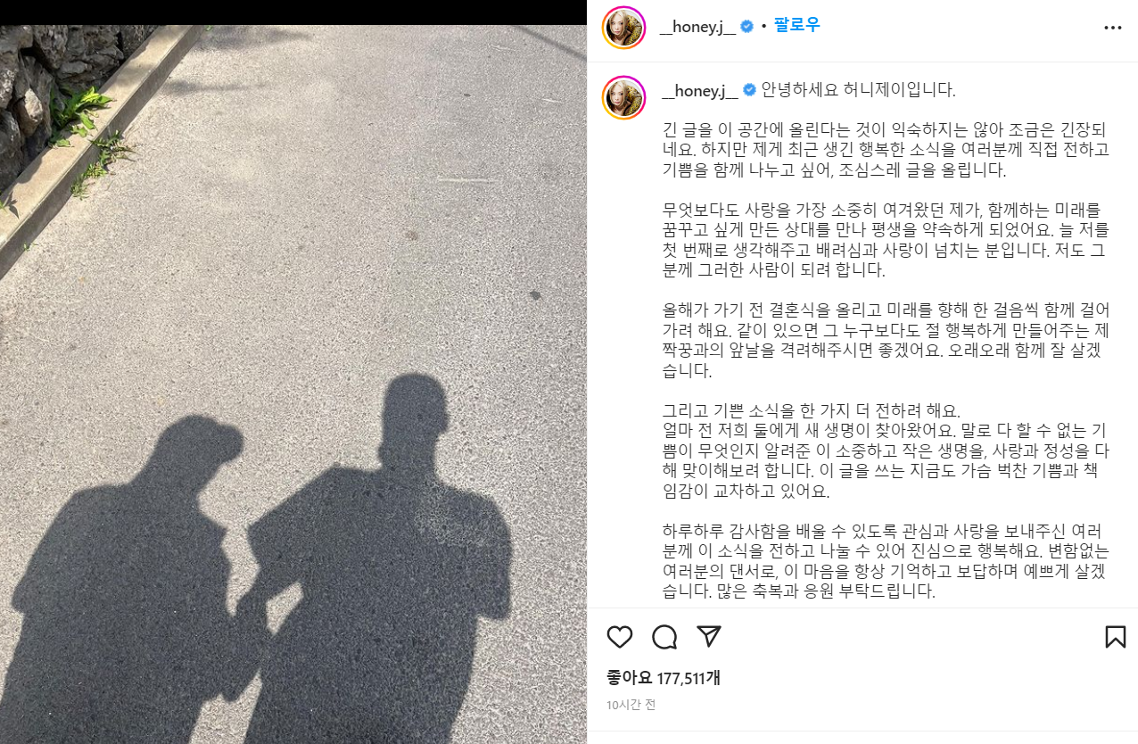 자신의 인스타그램에 장문의 글과 사진 한 장을 올린 허니제이는 올해 결혼을 계획하고 있고 또 임신도 하였다며 기쁜 소식을 팬들에게 전하였습니다.