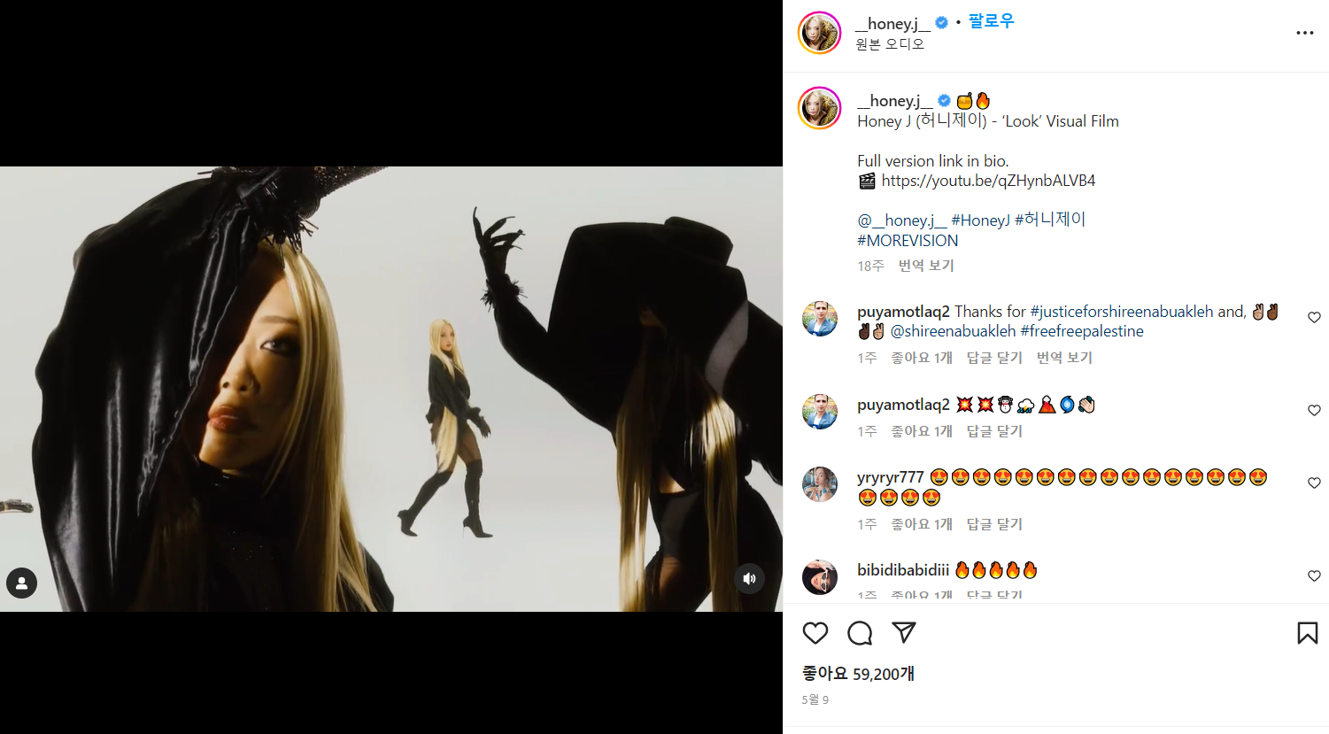 허니제이의 인스타는 1449개의 게시물이 있으며 최근 게시물은 얼마전 발표한 디지털 싱글 허니드롭의 챌린지 영상이 대부분입니다.