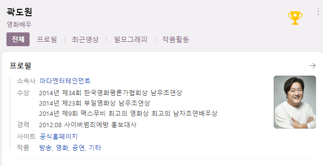 곽도원씨는 1992년 연극으로 데뷔하였으며 영화 변호인, 신세계, 곡성, 남산의 부장들, 국제수사 등의 흥행작이 많습니다.