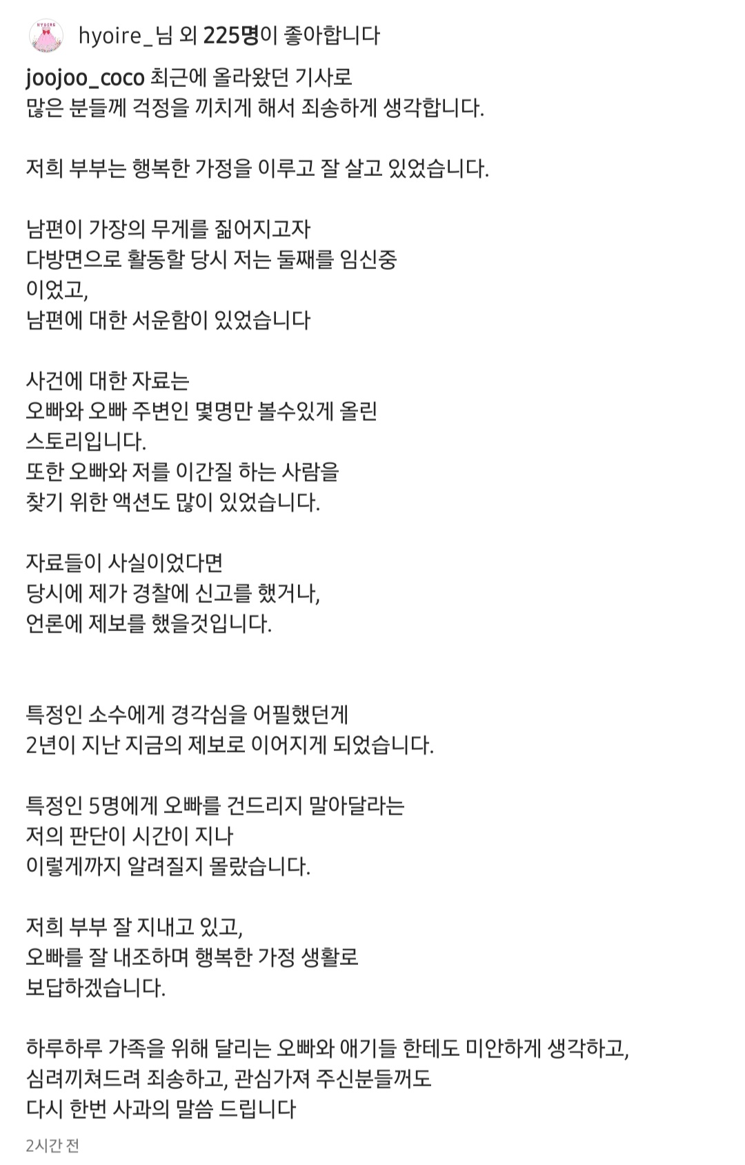 언론에 크게 보도 되자 인스타에 해명 글이 올라왔습니다.