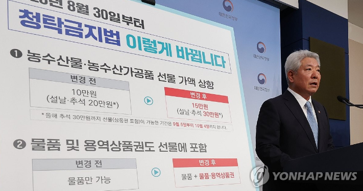 8월 30일부터 공직자 선물에게 줄 수 있는 선물의 금액이 변경 됩니다.