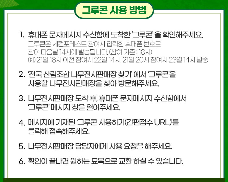 받은 그루콘은 전국 119개 산림조합 나무전시판매장에서 묘묙으로 교환할 수 있습니다.