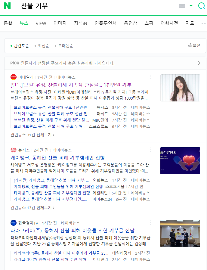 '산불 기부'라고만 검색해도 많은 연예인, 기업인, 그리고 단체 등의 기부 뉴스를 접할 수 있습니다.