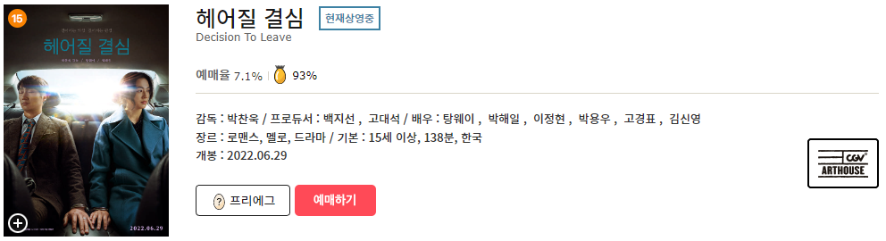 박찬욱 감독의 헤어질 결심이 꾸준하게 인기네요.