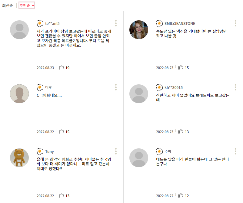 다른 영화들이 기대 이하이다보니 6월 개봉한 탑건이 아직도 순위권에 있네요.