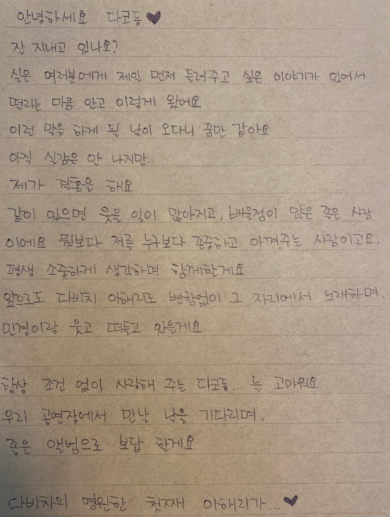 팬들에게 결혼 소식을 직접 손편지에 적어 전한 이해리는 소속사에 의하면 올해 7월 비연예인 남자친구와 친지와 지인만 참석하는 비공개 결혼식을 한다고 밝혔습니다.