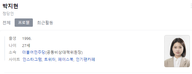1996년생 27세의 젊은 나이로 민주당의 중요한 자리를 맡게 된 박지현은 국회의원이나 도의원, 시의원 등의 이력은 없으며 20대 대선 민주당 중앙선거대책위원회 여성위원회 부위원장 정도만의 활동 경력이 있을 뿐입니다.