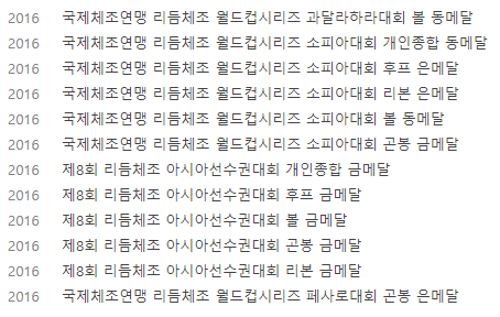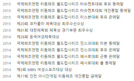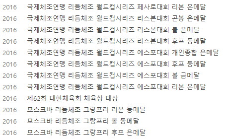 2005년 전국소면체육대회 여자초등부 리듬체조 금메달을 시작으로 초등생 시절은 대부분의 리듬체조 대회에서 1위를 기록하였고 중고등생 시절 국제대회에 나서서도 최소 동메달을 차지하였으며 이후 성인시절에도 좋은 성적을 거두며 대한민국 리듬체조의 대표주자였습니다.