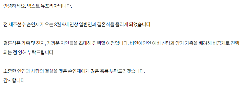 손연재의 결혼 소식은 소속사인 넥스트 유포리아가 발표했습니다.