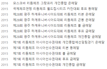 2005년 전국소면체육대회 여자초등부 리듬체조 금메달을 시작으로 초등생 시절은 대부분의 리듬체조 대회에서 1위를 기록하였고 중고등생 시절 국제대회에 나서서도 최소 동메달을 차지하였으며 이후 성인시절에도 좋은 성적을 거두며 대한민국 리듬체조의 대표주자였습니다.