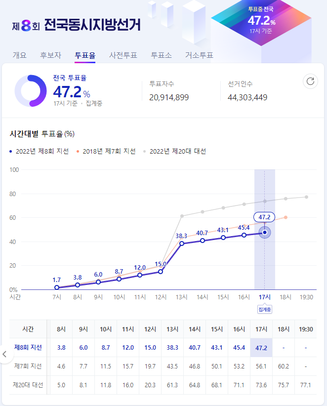오후5시(17시) 현재 전국 투표율은 47.2%로 4년 전 제7회 지방선거(17시 기준 56.1%)에 비해 8.9% 낮은 투표율을 보이고 있습니다.