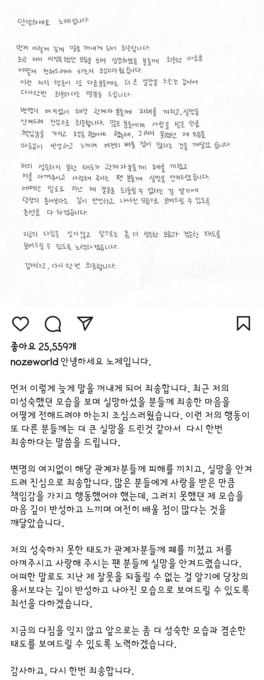 인스타에서 광고 갑질을 했던 노제가 사과문을 올렸습니다.