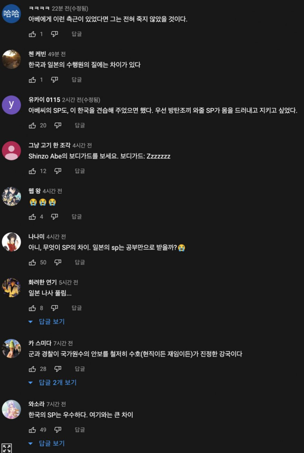 한편 일본인들은 한국과 일본의 전 대통령/총리에 대한 경호에 대해 비교를 하였습니다.