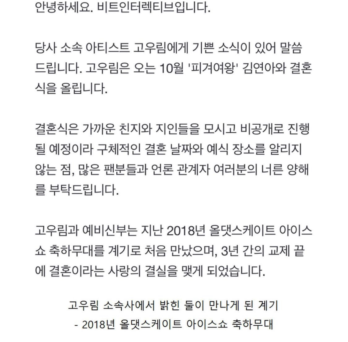 김연아와 고우림은 다가오는 10월 22일 서울 신라호텔에서 비공개 결혼식을 올립니다.