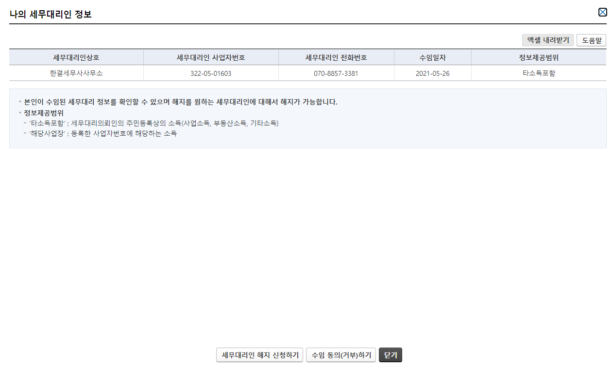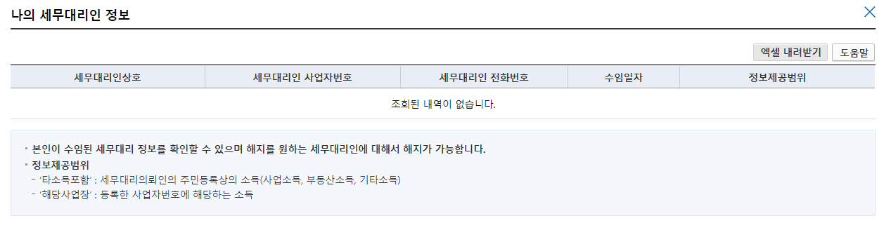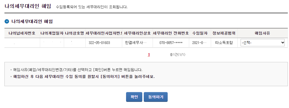 간단하게 해임을 한 후 다시 나의 세무대리인 정보를 조회해 봤습니다.