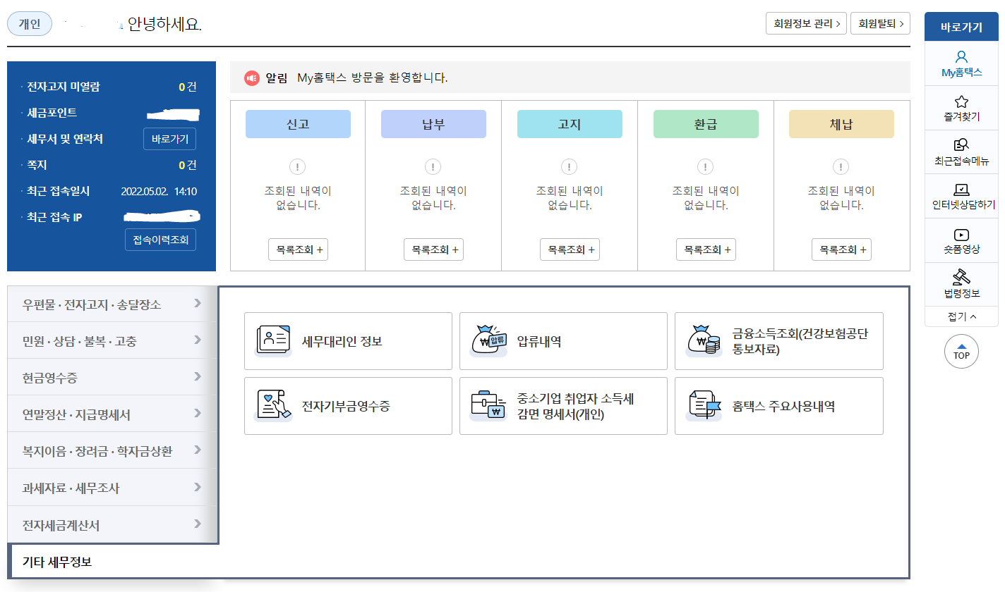 로그인을 하고 나면 오른쪽 메뉴 맨 아래에 '기타 세무정보'가 있습니다.